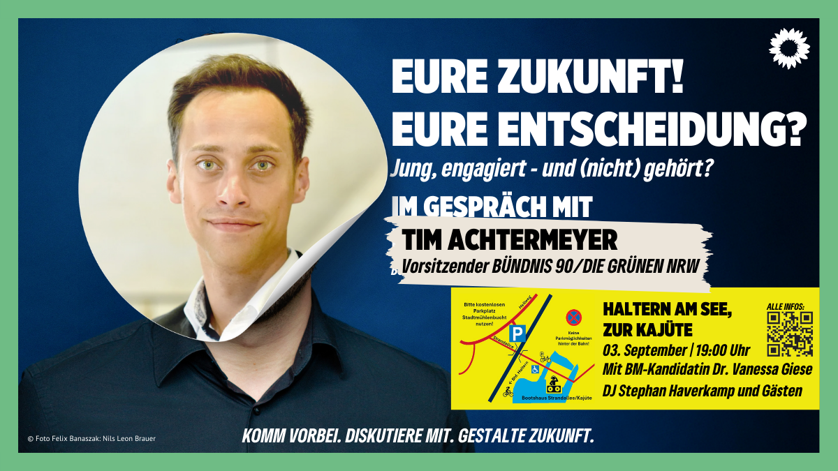 Die GRÜNEN Haltern laden euch ein zu einem besonderen Abend am 3. September 2025 ab 19 Uhr in der Stadtmühlenbucht Haltern. Unter dem Motto „EURE ZUKUNFT! EURE ENTSCHEIDUNG?“ sprechen wir mit Euch über die Themen, die junge Menschen wirklich bewegen: Wie können wir mehr mitbestimmen? Welche Chancen gibt es für eine nachhaltige Zukunft? Und: Was heißt das konkret für Haltern?